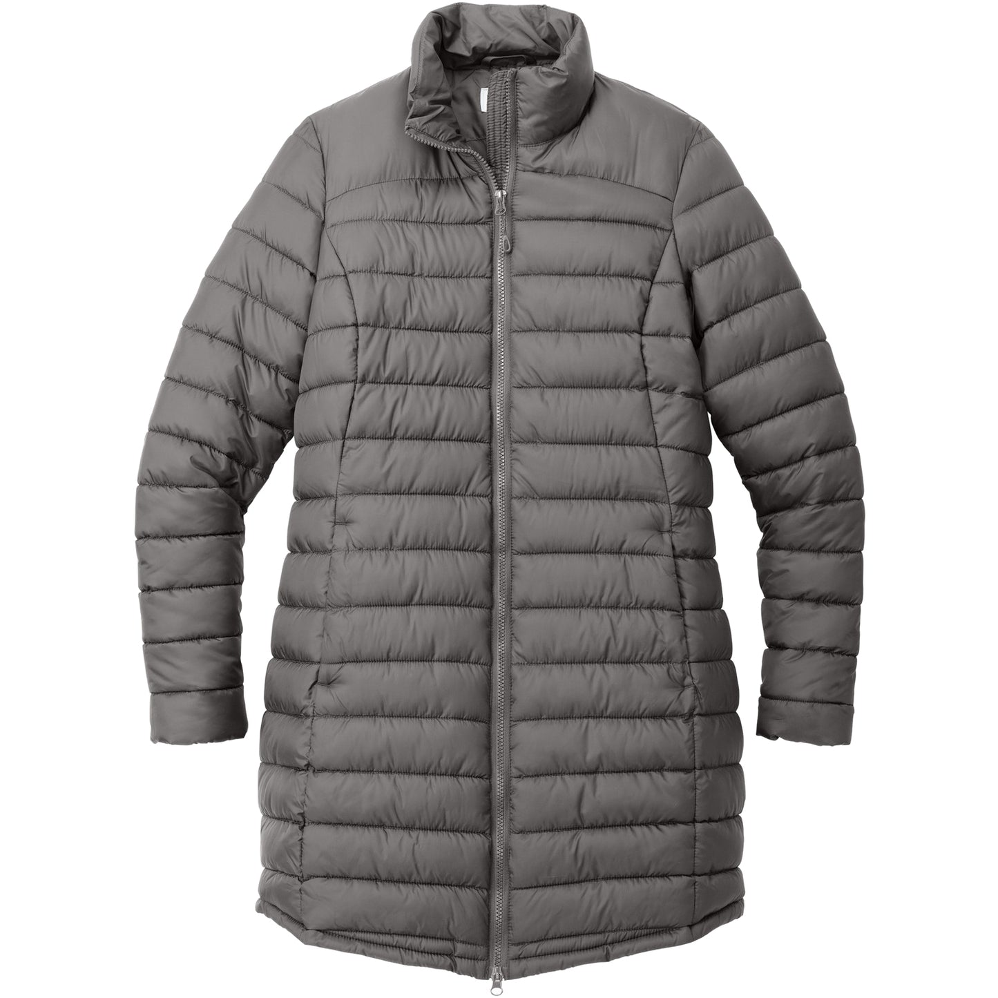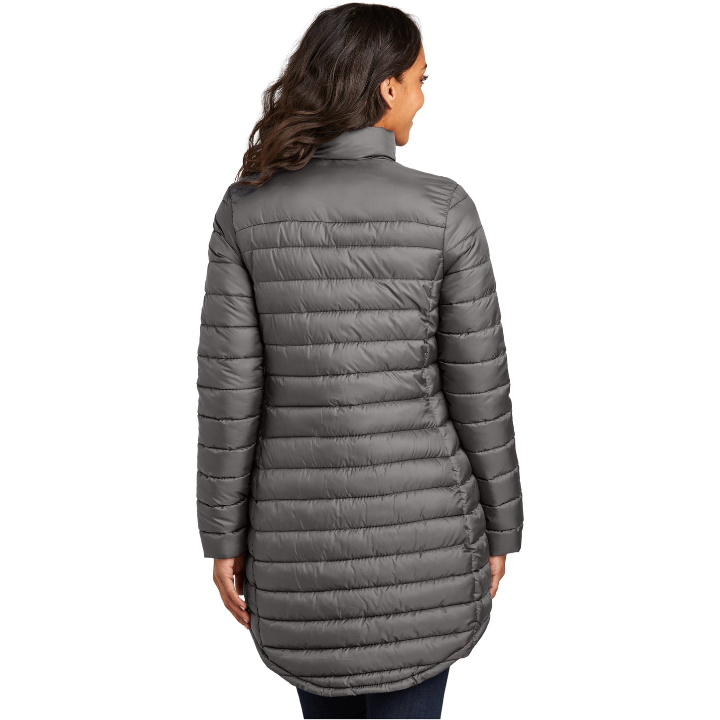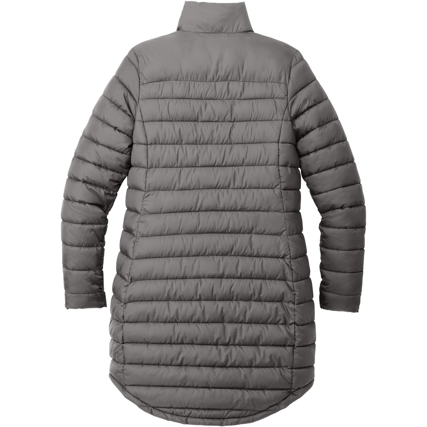 • Horizontal baffles with slight sheen, longer length jacket silhouette.