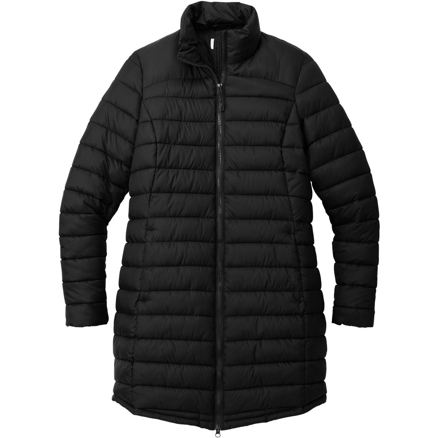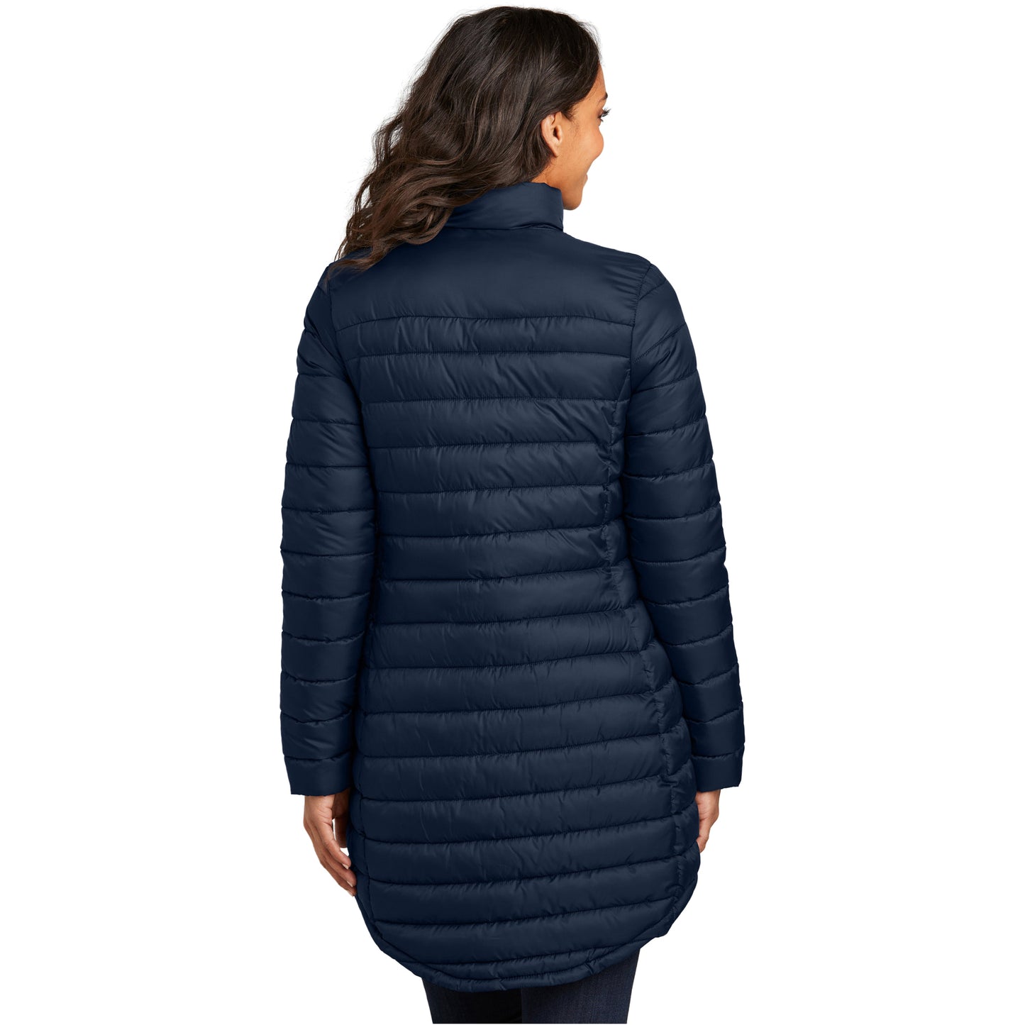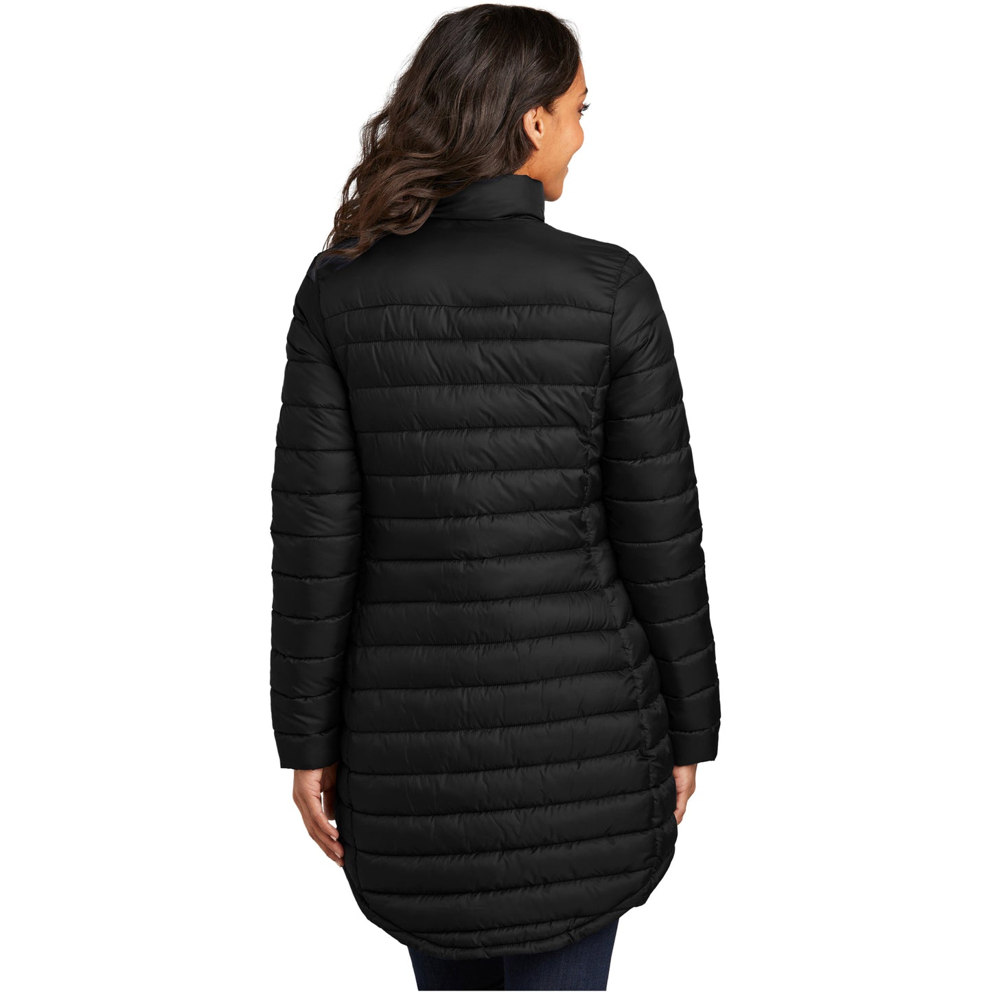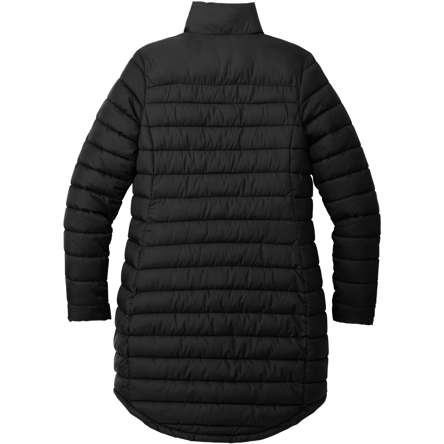 • Horizontal baffles with slight sheen, longer length jacket silhouette.